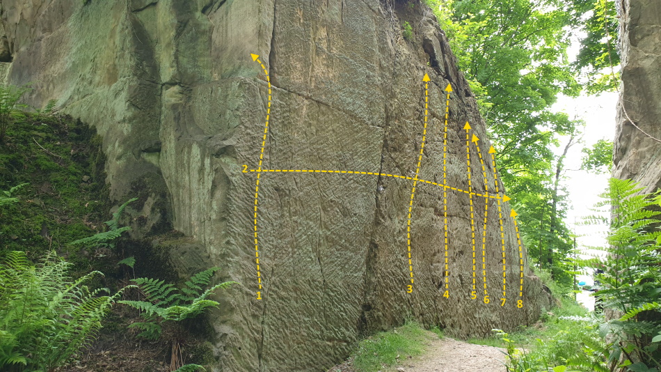 | 7 | Facist | 4 | From a horizontal pinch pocket at 5’ climb direct to the horizontal crack, avoid the large pocket on the left. |
