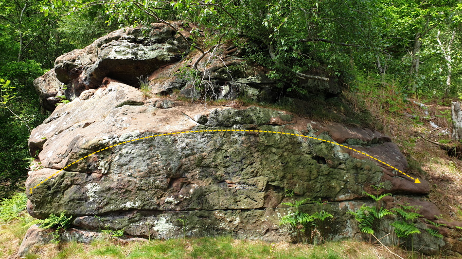From the Corbett Woods car park walk back out of the entrance and turn left. Follow the access road to just past Hollands Cottage then take the main path in to the woods on the left. After a short way the path bends right heading up to the trig point & beacon on route you pass a gully down to your left, Bat Rocks is down the gully on the left.