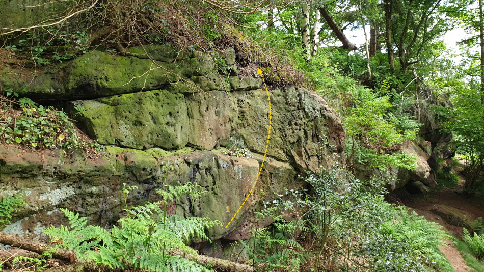 | 1 | Sharp Pocket Wall | 4 | The small buttress at the western approach just before the main rocks (left end facing in). Sit downstart below the small alcove roof, pull directly over the roof using sharp pockets to large finishing pocket. |