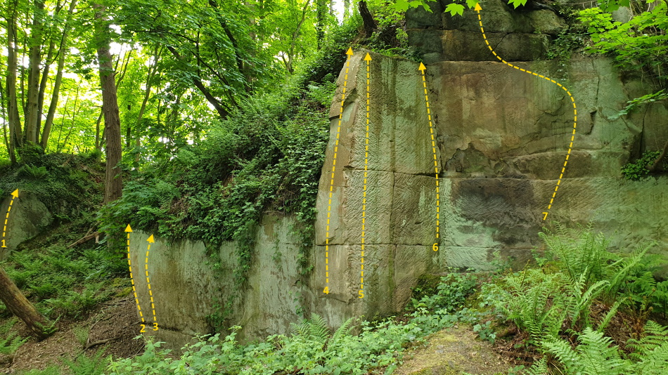 | 7 | Bean | 6A | Start on the left end of the rail, rock over to a large side pull on the right, make a big reach to the next ledge. Head up leftwards for two big pocket holds and finish off to the left. |