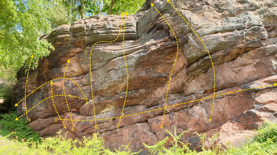 | 9 | Cig Arete | 4+ | Easy breaks lead to a commiting arete with long reaches and a scary pull to easier ground.Serious landings. |
