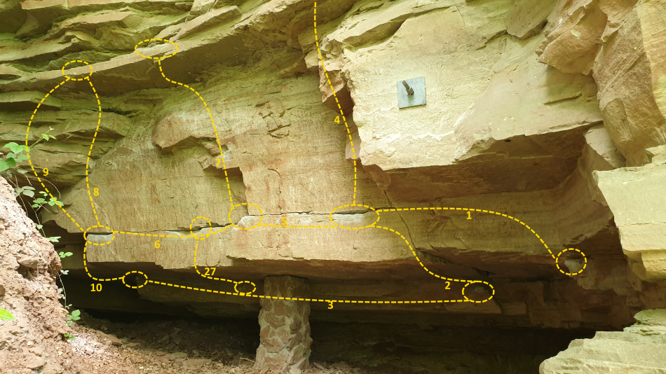 | 27 | | ?? | Start on the back wall, just left of the pillar. Use undercuts to pull directly through the roof to the break. |