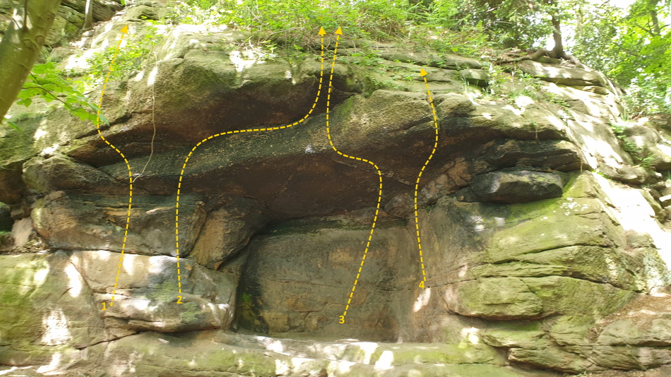 | 3 | Sore Tips | 7A | The main challenge has repelled many. A serious proposition due to the poor landing. Climbthe overhang at its widest using an upward bore hole. |
