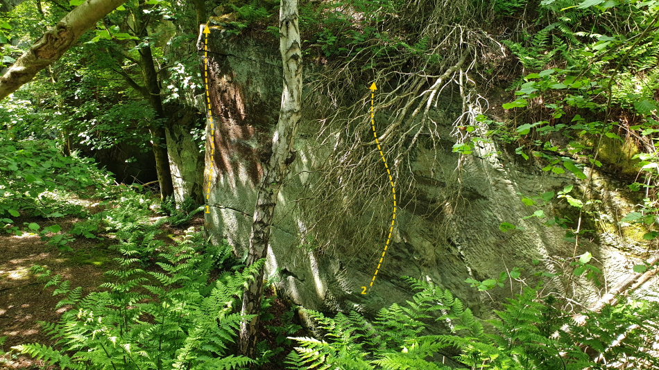| 2 | Inspector Moss | 6C+ | From the lowest part of the wall, undercut the lower horizontal break to eventually reach the sloping ramp. Make a scary rock-over to pass the sloping ramp and gain the top. Feels more like E4 6b and currently in desperate need of cleaning. |