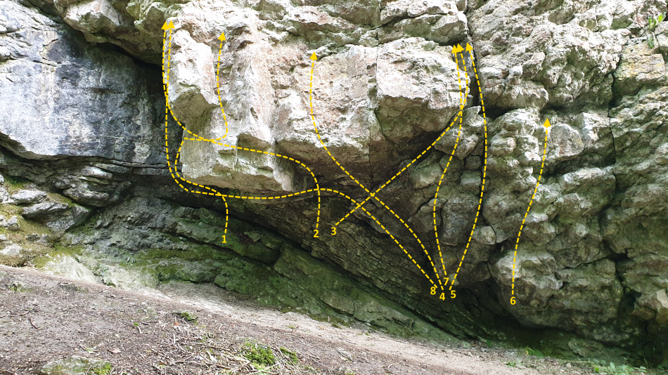 | 1 | | 6C+ | Start in the breaks at the back left of the bulge. Traverse out then pull out over the bulge. Then continue up the groove to the break. |