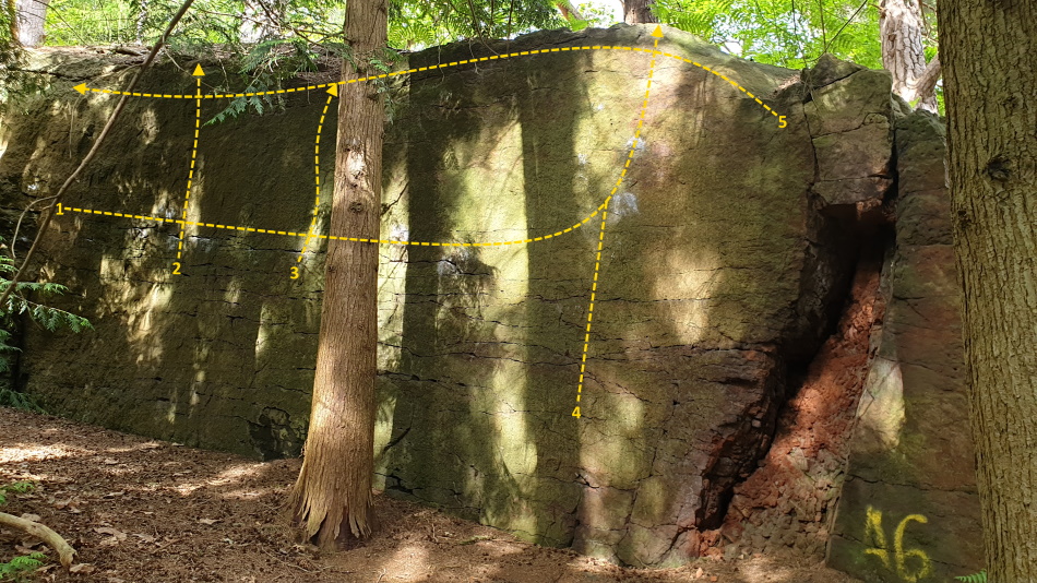 | 7 | Kneel Hook Traverse | 6B | start sitting at the low nose by the path. Follow slopers left. Top out on jugs above the recess right of rampant chopper. Take a brush. |