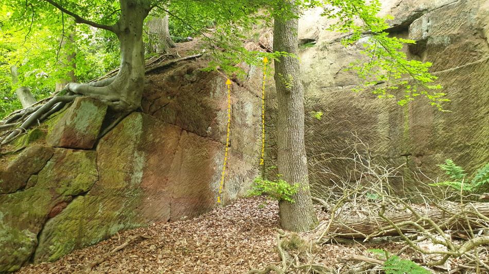 From the car park enter the woods and turn right and follow the main path until you reach the stairs. From the top of the stairs follow the track on your left up the hillside and when you reach the bold arete of Open Air (E3), turn back on yourself and continue walking uphill.