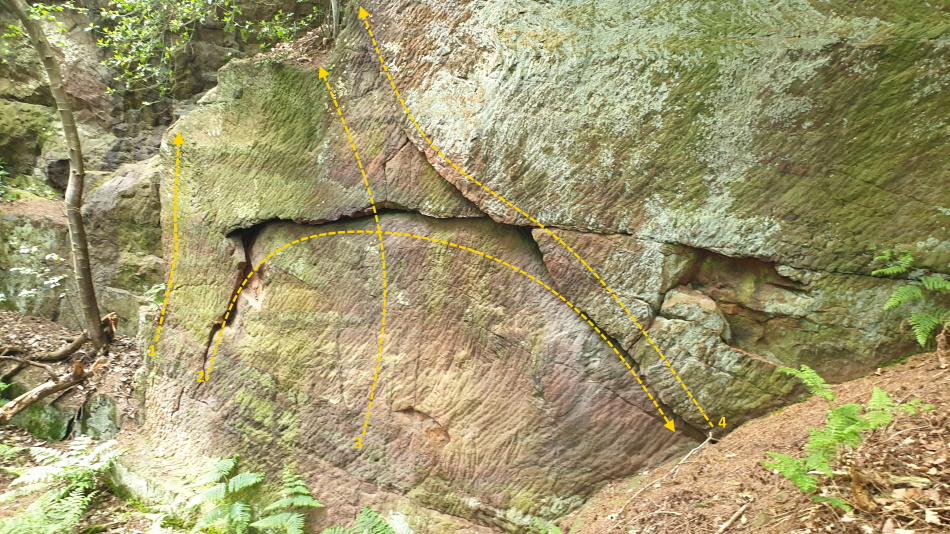 From the car park enter the woods, turn right and follow the main path. Go down the stairs and keep going. A little way after the main quarry you will come to the entrance of Cads Leap. From here a path on the right leads up to the wall.