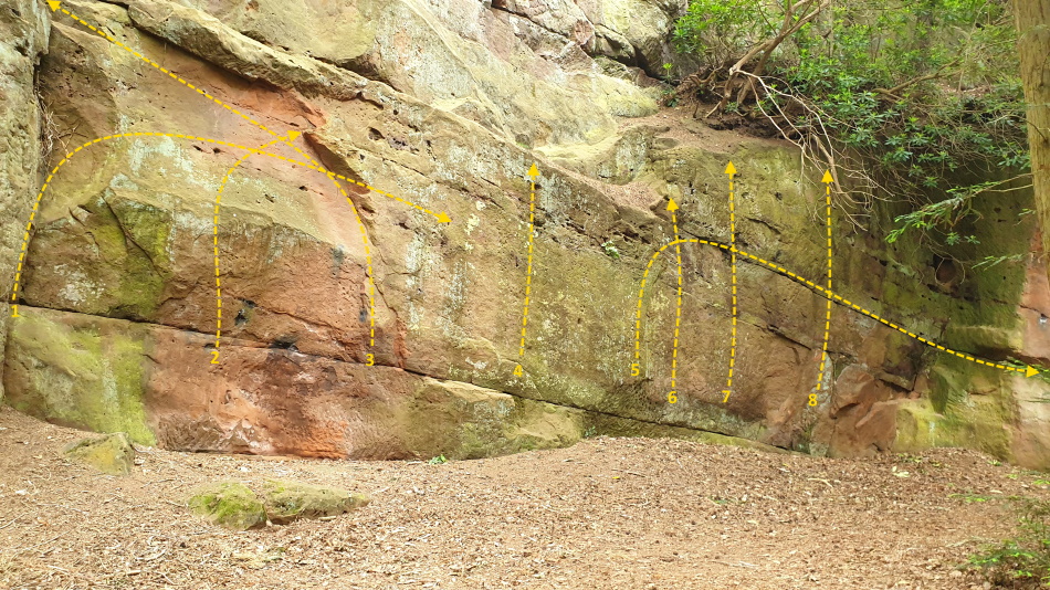 | 8 | Shropshire Slapper | 4 | Start at two short flake cracks, move up the steep wall to a down pointing hole pocket, the finish is to touch the short rib above it. |