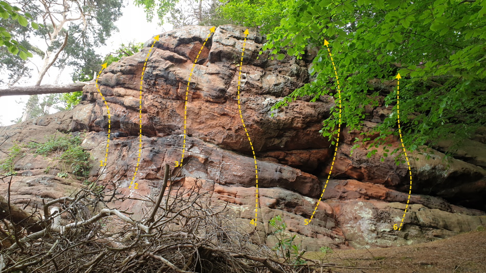 | 1 | Rubbish 1 | 4 | Up the horizontal breaks just left of Sunray, moving left at the top to a good finishing hold. |
