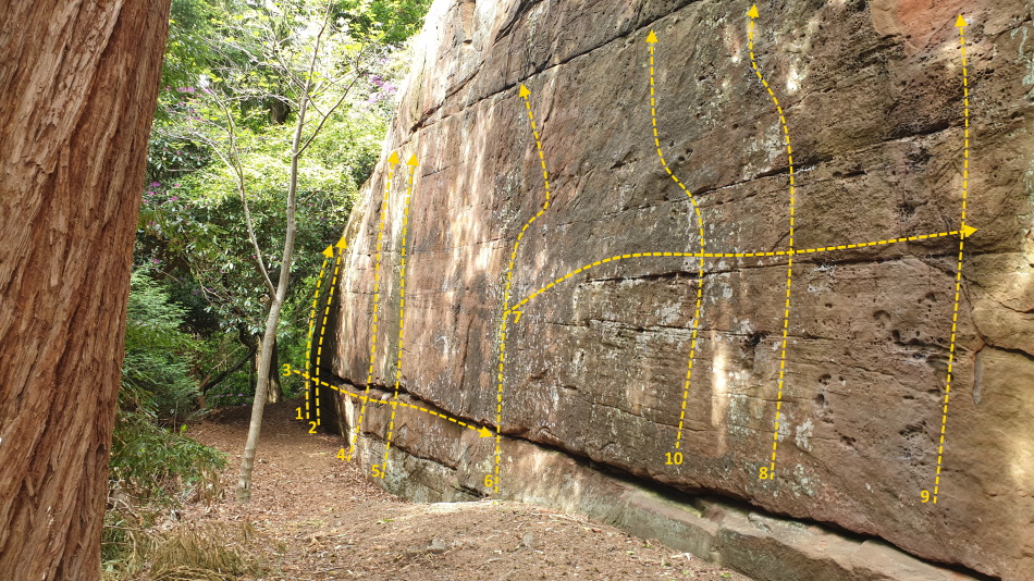 | 7 | Cholesterol Traverse | 7A | From a low start up the flake under Cholesterol, traverse right going first up and then down to make use of the best of the selection of crimps available. Finish at the wide foot ledge. |