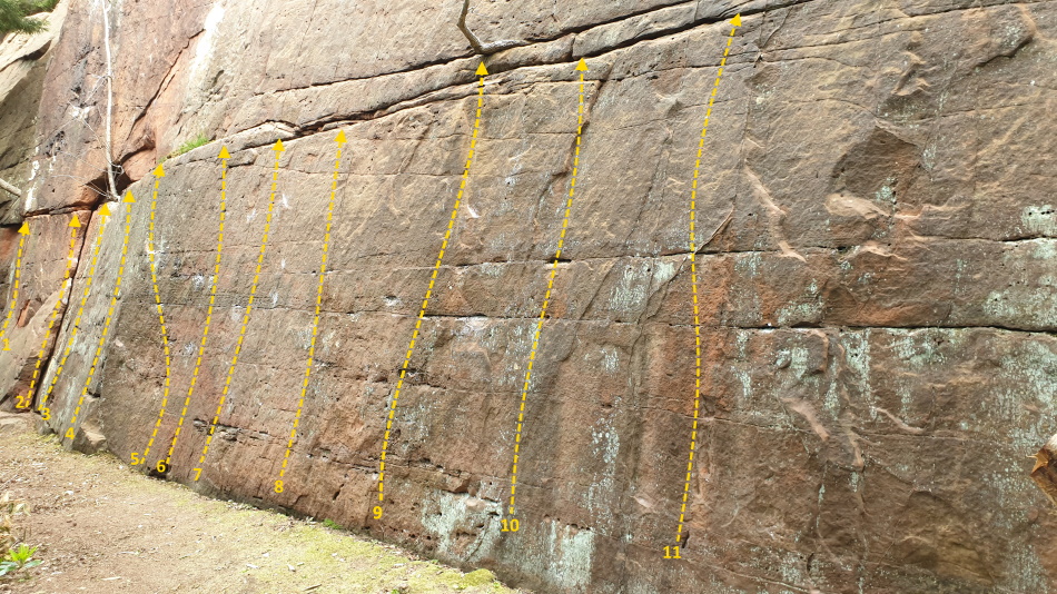 | 11 | Thread Hole | 5 | Start just to the right of an obvious vertical vein with what used to be a thread hole 6’ up the wall. Finish at the break. |