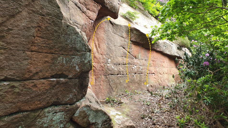 | 1 | Boosh | 4 | Climb the corner with a layback move at half height and a sharp vertical vein, finishing on a flat dusty hold right of the heather bush. |