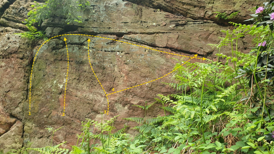 | 3 | Crescent Moon | 5 | A small crescent shaped left facing hanging corner in the middle of the wall is used to gain a sharp hold at its top plus then two finger pocket on Razorlite is used to reach the break. |