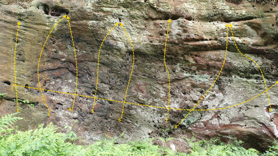 | 1 | Low Traverse | 6A | L-R traverse. From the horizontal break on Green Slab drop as low as possible to follow increasingly difficult pockets finishing up over the cave. |